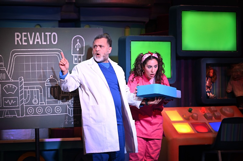 الديكور الذي أنجزه عمر زرد ليس مجرد “خلفية”، بل شخصية ثالثة في العرض، وربما الشخصية الأكبر. من يشاهد الصورة يدرك فورًا أننا أمام مدينةٍ علمية صغيرة، مصنعٍ مرح، مختبرٍ مسرحي تُضاء فيه الأشياء كما تُضاء الأفكار. الألوان الصارخة ليست للزينة وحدها، بل لأنها جزء من منطق الطفل: عالمه الداخلي ليس باهتًا، بل فاقعٌ، وكأن كل فكرة لديه تملك لونها الخاص. هناك شاشات، أبواب ضخمة، أنابيب، منصات، مجسّمات، وسلالم تجعل المكان يبدو كأنه لعبة عملاقة يمكن الدخول إليها. وهذه “الضخامة” في الديكور ليست مجرد رفاهية إنتاجية، بل لها وظيفة نفسية ومعنوية: الطفل يحب أن يشعر أن المسرح أكبر منه… لأن هذا يمنحه شعورًا بأن العالم واسع، وأن الخيال قادر على بناء مدنٍ كاملة فوق الخشبة.